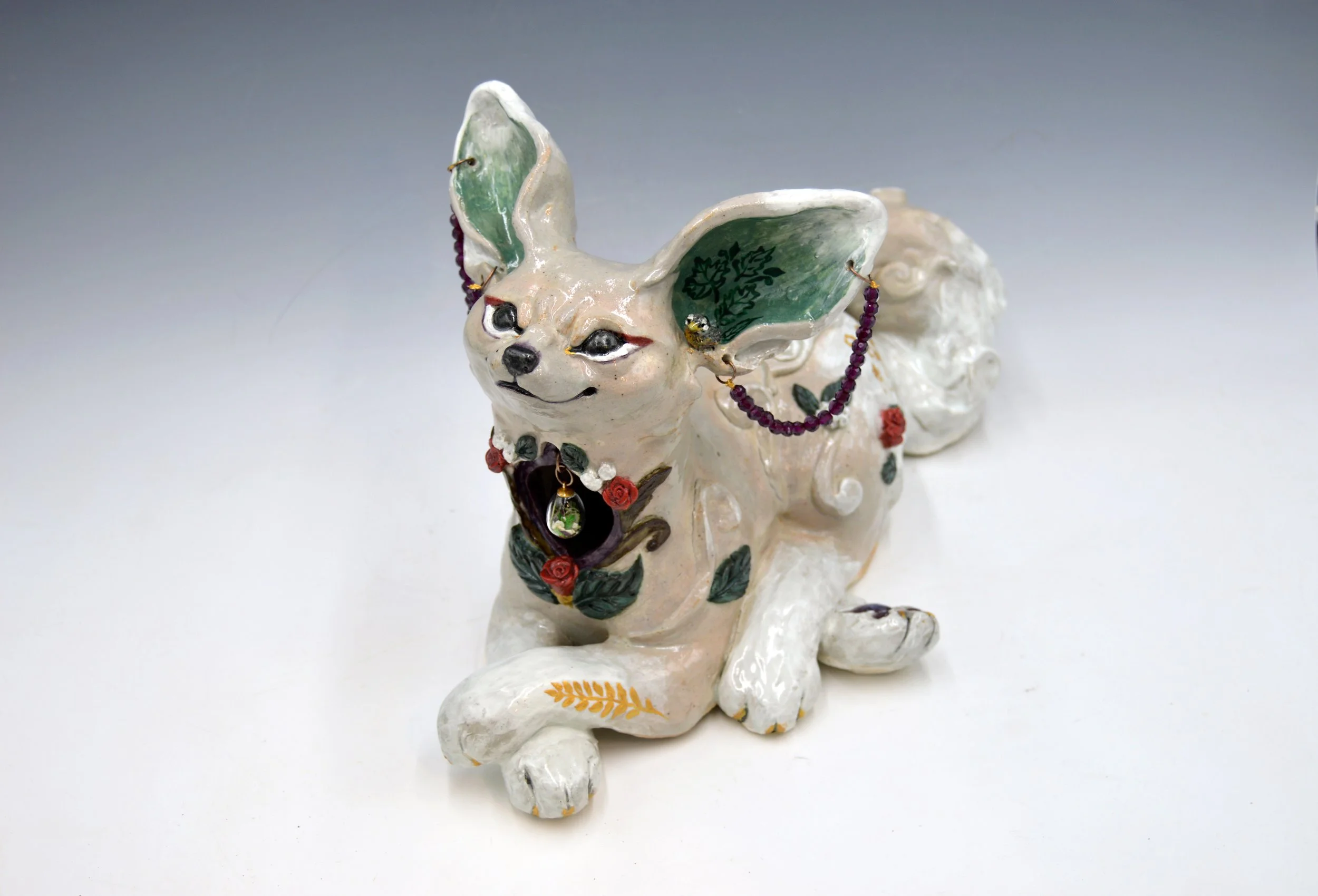 Glazed ceramic, acrylic paint, beads, dried plants in a glass vial